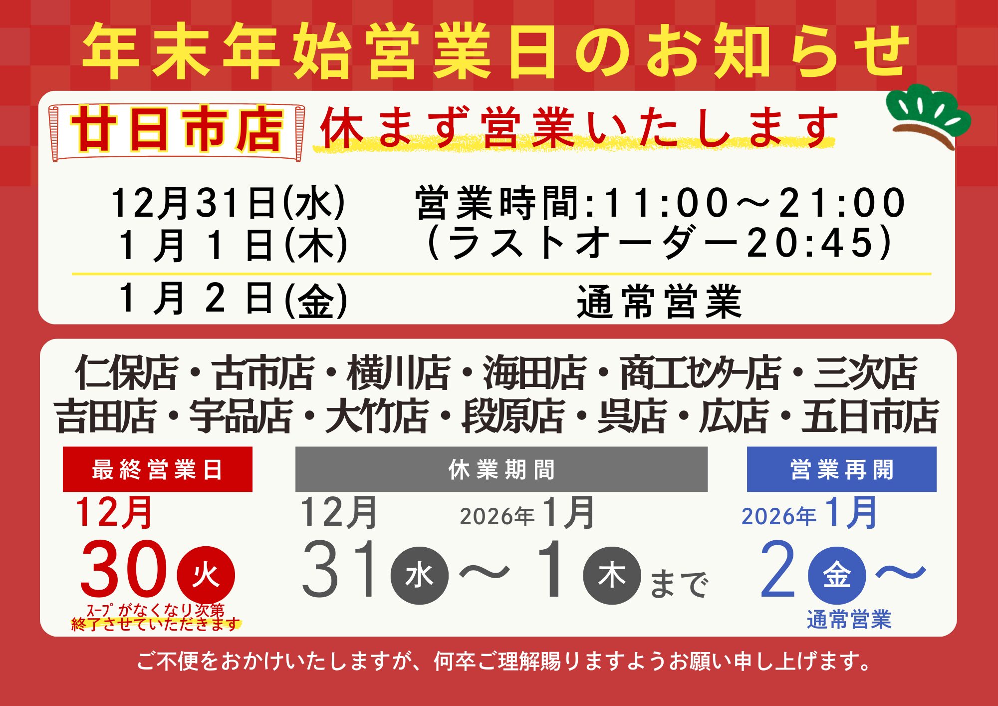 【年末年始】ご案内 お知らせ 2025.12.12 平素より、長浜ラーメン博多屋をご愛顧いただき誠にありがとうございます。 各店の年末年始の営業についてご案内いたします。 新年も変わらぬご愛顧のほど、よろしくお願い申し上げます。